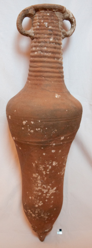 Anfora del tipo Égyptienne Bitronconique 3, con corpo allungato che si restringe verso il basso, a siringa, verso un solido puntale. La spalla è ben distinta in questo esemplare, ma non segnata da una linea di divisione. Il collo, lungo e cilindrico, è caratteristicamente lavorato e decorato con ingrossature cilindriche successive. Le anse, ad orecchio, hanno sezione ellittica. Il labbro è a sezione circolare con una incisione superficiale.