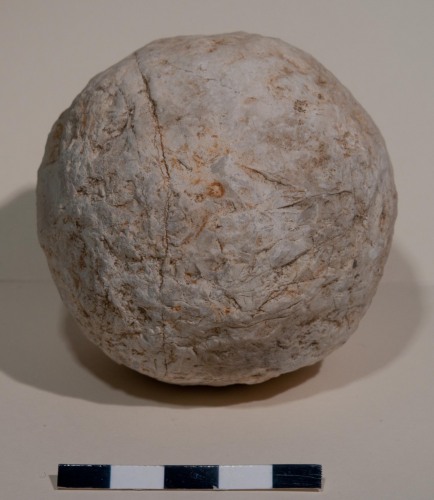 Proiettile, sfera da artiglieria in pietra calcarea bianca, lisciata in superficie. La palla ha un calibro di 8,5 cm, ed è compatibile con armi da artiglieria leggera da campo quali la colubrina media/piccola o il falcone/falconetto, e probabilmente va associata ad una cronologia tra il XV e il XVI secolo. Il calcare sembra essere un calcare veneto, in particolare il Biancone dei vicini Colli Euganei (Padova).