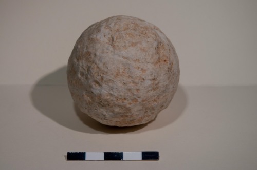 Proiettile, sfera da artiglieria in pietra calcarea bianca, lisciata in superficie e leggermente gradinata. La palla ha un calibro di 7,2 cm, ed è compatibile con armi da artiglieria leggera da campo quali la colubrina media o il falcone/falconetto, e probabilmente va associata ad una cronologia tra il XV e il XVI secolo. Il calcare sembra essere un calcare veneto, in particolare il Biancone dei vicini Colli Euganei (Padova).