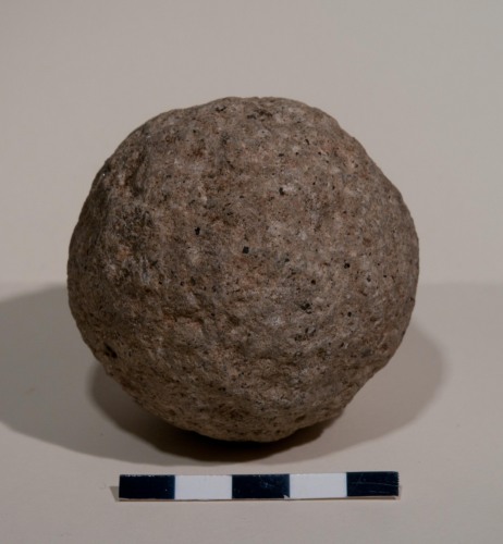 Proiettile, sfera da artiglieria in pietra vulcanica di colore grigio/giallo/marrone ricca di miche (nere) e feldspati . Leggermente lisciata in superficie e leggermente gradinata. La palla ha un calibro di 6,5 cm, ed è compatibile con armi da artiglieria leggera da campo quali la colubrina media o il falcone/falconetto, e probabilmente va associata ad una cronologia tra il XV e il XVI secolo. La roccia sembra essere un litotipo piuttosto pregiato e tenace, di origine veneta, ovvero la trachite dei vicini Colli Euganei (Padova). Si tratta dello stesso materiale con cui sono realizzate le pavimentazioni stradali tardo medievali e rinascimentali a Venezia.