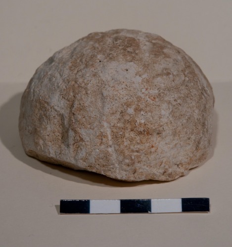 Proiettile, mezza sfera da artiglieria in pietra calcarea bianca, lisciata in superficie e leggermente gradinata.