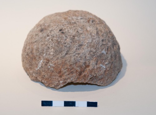 Proiettile, sfera da artiglieria in pietra vulcanica di colore grigio/giallo/marrone ricca di miche (nere) e feldspati . Leggermente lisciata in superficie e leggermente gradinata. La palla ha un calibro di 10,5 cm, ed è compatibile con armi da artiglieria leggera da campo quali la colubrina media o il falcone/falconetto, e probabilmente va associata ad una cronologia tra il XV e il XVI secolo. La roccia sembra essere un litotipo piuttosto pregiato e tenace, di origine veneta, ovvero la trachite dei vicini Colli Euganei (Padova). Si tratta dello stesso materiale con cui sono realizzate le pavimentazioni stradali tardo medievali e rinascimentali a Venezia.