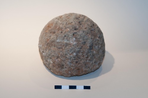Proiettile, sfera da artiglieria in pietra vulcanica di colore grigio/giallo/marrone ricca di miche (nere) e feldspati . Leggermente lisciata in superficie e leggermente gradinata. La palla ha un calibro di 10,2 cm, ed è compatibile con armi da artiglieria leggera da campo quali la colubrina media o il falcone/falconetto, e probabilmente va associata ad una cronologia tra il XV e il XVI secolo. La roccia sembra essere un litotipo piuttosto pregiato e tenace, di origine veneta, ovvero la trachite dei vicini Colli Euganei (Padova). Si tratta dello stesso materiale con cui sono realizzate le pavimentazioni stradali tardo medievali e rinascimentali a Venezia.
