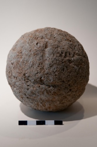 Proiettile, sfera da artiglieria in pietra vulcanica di colore grigio/giallo/marrone ricca di miche (nere) e feldspati . Leggermente lisciata in superficie e leggermente gradinata. La palla ha un calibro di 10 cm, ed è compatibile con armi da artiglieria leggera da campo quali la colubrina media o il falcone/falconetto, e probabilmente va associata ad una cronologia tra il XV e il XVI secolo. La roccia sembra essere un litotipo piuttosto pregiato e tenace, di origine veneta, ovvero la trachite dei vicini Colli Euganei (Padova). Si tratta dello stesso materiale con cui sono realizzate le pavimentazioni stradali tardo medievali e rinascimentali a Venezia.