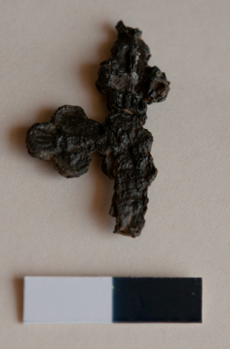 Croce pendente assimilabile ad un insegna da pellegrino, del tipo signum crucis. Si tratta di un frammento di croce latina, realizzata a stampo, decorata alle estremità da tre lobi, realizzati da dischetti di metallo saldati insieme. Sul verso, negli stessi lobi, si conserva la decorazione di croci greche apicate.