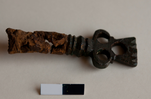 Chiave in metallo (ferro), restaurata solo nella parte della decorazione dellimpugnatura. La decorazione, presente su ambo le facc, vede tre fori circolari del medesimo diametro posti a piramide entro una sagoma metallica ritagliata a forma di corona merlata. La corona è decorata daquattro piccole incisioni a forma verticale. Il corpo della chiave ha una sezione di ottagonale: si tratta di un ottagono irregolare. La stessa sezione è ben visibile nelle 4 fascette restaurate che costituiscono il punto di passaggio dallimpugnatura al corpo della chiave. Il corpo di apertura è molto rovinato, non restaurato.