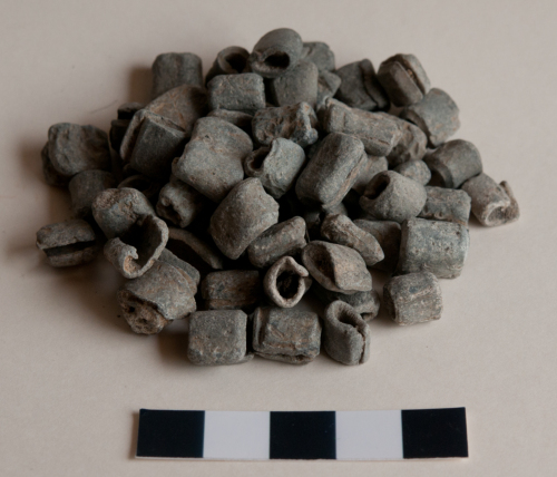 Gruppo 61 di pesi di piombo di piccole dimensioni, si tratta di fascette rettangolari con in media misure di 0,7-1 x 1,5 cm. Questo tipo di pesi erano saldati lungo il bordo delle reti, a distanze regolari, per facilitare il movimento in acqua.