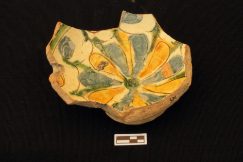 Scodella con piede ad anello leggemente umbonato, corpo emisferico schiacciato e orlo verticale indistinto. All'interno è presente un decoro a festoni pendenti che circondano un grande fiore centrale, i cui petali sono marcati alternativamente da pennellate di colore giallo e blu. Sul cavetto si notano i segni lasciati dal distacco del treppiede di cottura.