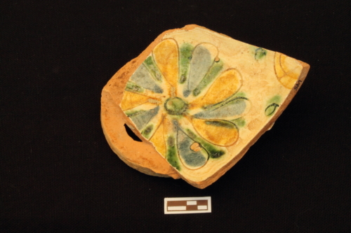 Scodella con piede ad anello leggemente umbonato e corpo emisferico schiacciato. All'interno è presente un decoro a festoni pendenti che circondano un grande fiore centrale, i cui petali sono marcati alternativamente da pennellate di colore giallo e blu. Sul cavetto si notano i segni lasciati dal distacco del treppiede di cottura.