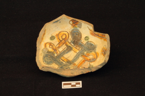 Scodella con piede ad anello leggemente umbonato e corpo emisferico schiacciato. Nel cavetto sono presnti due nodi di Salomone intrecciati, marcati da pennellate l'uno di colore blu e l'altro giallo. Lo spazio di risulta è campito da piccole losanghe tagliate in croce. Sul cavetto si notano i segni lasciati dal distacco del treppiede di cottura.
