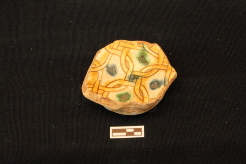 Scodella con piede ad anello leggemente umbonato e corpo emisferico schiacciato. Nel cavetto è presente un complesso motivo a intreccio, con gli spazi di risulta campiti da losanghe tagliate in croce, marcate da pennellate di colore verde o blu.