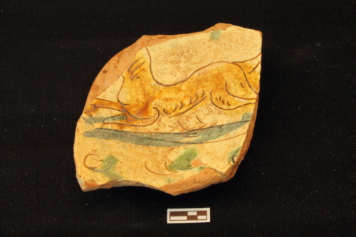 Scodella con piede ad anello leggemente umbonato e corpo emisferico schiacciato. All'interno è presente un decoro zoomorfo con un cane volto a sinistra, il cui corpo è marcato da pennellate di colore giallo. Sul cavetto si notano i segni lasciati dal distacco del treppiede di cottura.