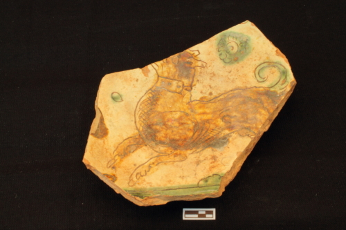 Scodella con piede ad anello leggemente umbonato e corpo emisferico schiacciato. All'interno è presente un decoro zoomorfo con un cane volto a sinistra, il cui corpo è marcato da pennellate di colore giallo. Sullo sfondo è raffigurato un fiore verde molto stilizzato mentre alla base è presente un cespuglio. Sul cavetto si notano i segni lasciati dal distacco del treppiede di cottura.
