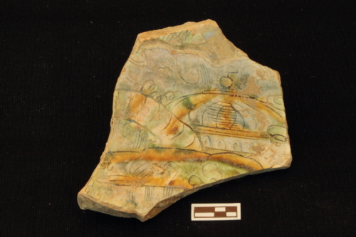 Piatto con piede ad anello leggemente umbonato e corpo a profilo obliquo. La superficie interna del cavetto è interamente decorata con un soggetto paesaggistico, di cui sono riconoscibili un ponte in primo piano e la cupola, sormontata da una croce, di un edificio sacro sullo sfondo. Sul cavetto si notano i segni lasciati dal distacco del treppiede di cottura.