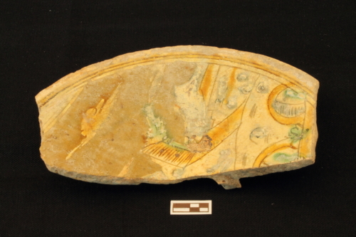 Piatto con piede ad anello leggemente umbonato, corpo a profilo obliquo, orlo indistinto e labbro arrotondato. La superficie interna è interamente decorata con un soggetto paesaggistico, di cui sono riconoscibili un ponte in primo piano e alcune corstruzioni di gusto rovinistico sullo sfondo. Sul cavetto si notano i segni lasciati dal distacco del treppiede di cottura.