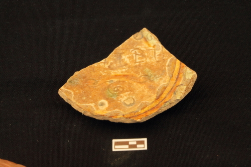 Scodella con piede ad anello leggemente umbonato e corpo emisferico schiacciato. All'interno del cavetto, racchiuso superiormente e inferiormente da racemi floreali stilizzati, è presente l'iscrizione "(TR)IPE" riconducibile al nome di una pietanza (trippe). Sul cavetto si notano i segni lasciati dal distacco del treppiede di cottura.