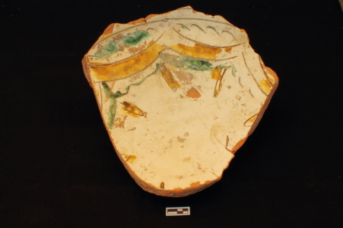 Scodellone con piede ad anello leggemente umbonato e corpo emisferico schiacciato. Internamente, la vasca presenta un decoro a festone pendente, che circonda il caul cavetto. Sul cavetto si notano i segni lasciati dal distacco del treppiede di cottura.