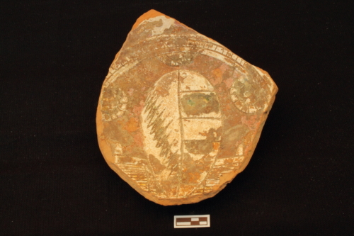 Scodella con piede ad anello leggemente umbonato e corpo emisferico schiacciato. Sul cavetto, all'interno di un medaglione a scaletta e con sullo sfondo "l'hortus conclusus", è presente uno stemma araldico conformato a scudo bipartito, circondato da tre grandi fiori. Sul cavetto si notano i segni causati dal distacco del treppiede di cottura.