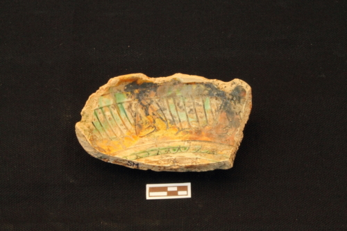 Scodella con corpo emisferico schiacciato, orlo indistinto e labbro arrotondato. All'interno è presente un medaglione, campito da un motivo decorativo non meglio definibile, racchiuso entro una fascia dipinta in verde e campita da una sequenza di archetti. La vasca presenta una fascia che racchiude una sequenza di "fiamme" dipinte mentre lo spazio di risulta appare campito da una sequenza di linee verticali.