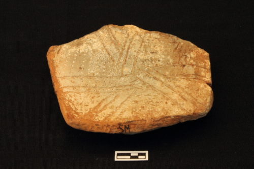 Scodellone con piede ad anello leggemente umbonato e corpo emisferico schiacciato. Il manufatto presenta una evidente deformazione della vasca, che permette di identificarlo come uno scarto di prima cottura.