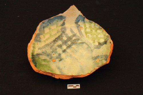 Scodellone con piede ad anello leggemente umbonato e corpo emisferico schiacciato. All'interno è riconoscibile un decoro vegetale stilizzato formato da quattro grandi inflorescenze contrapposte, dipinte in verde scuro e campite da un motivo a graticcio dipinto in verde chiaro. Sul cavetto si notano i segni lasciati dal distacco del treppiede di cottura.