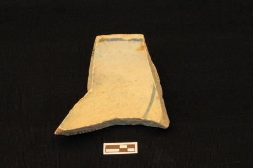 Piatto con corpo emisferico schiacciato, orlo a tesa obliqua sporgente e labbro arrotondato. Del decoro originariosi riconosce solo una sottile linea dipinta in blu.