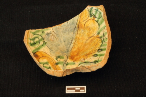 Scodella con piede ad anello leggemente umbonato, corpo emisferico schiacciato e orlo indistinto verticale. All'interno, la scodella è decorata con un motivo vegetale stilizzato, caratterizzato da una grande foglia bipartita, marcata da una parte dipinta in blu e l'altra in giallo. Il fondo è interamente campito da spiralette marcate da pennellate di colore verde. Sul cavetto si notano i segni lasciati dal distacco del treppiede di cottura.