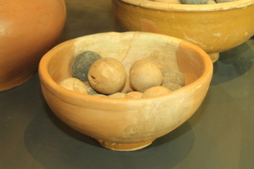 Scodella con piccolo piede ad anello, corpo emisferico schiacciato, orlo leggermente estroflesso e labbro arrotondato. Al momento della schedatura il reperto, di cui non è stato possibile analizzare autopticamente il decoro, risulta contenere numerosi proiettili sferoidali di terracotta.