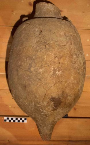 Anfora vinaria tipo Lamboglia 2, priva di collo e anse. Presenta pareti molto spesse. Tale tipo di anfora ha con un collo a forma di tronco di cono alla base che poi si sviluppa, verso il labbro, a forma decisamente cilindrica. In queste anfore in genere il labbro è spesso, è a sezione triangolare e presenta una leggera sporgenza verso l'esterno. Le anse a bastoncello, sezione elittico-cilindrica, sono spesse e impostate 1,5 cm sotto il labbro e direttamente sulla spalla. La spalla è segnata da una decisa carenatura che segna l'inizio del corpo: in questo esemplare la rottura corrisponde al punto di carenatura. L'argilla, piuttosto depurata è di colore grigio, con miche.