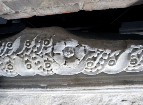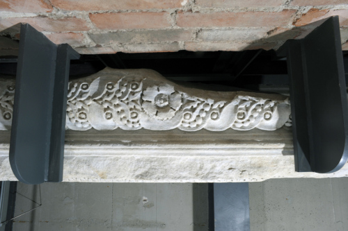 Il blocco di marmo è caratterizzato, a partire dall'alto, da un fregio decorato con un cespo d'acanto centrale da cui si dipartono due girali con ciascuno un leone rampante al centro, rivolto verso l'esterno. Il fregio è incorniciato inferiormente da un listello liscio, da un kymation lesbio continuo con elemento a forbice aperta fino alla base, una fila di perline, un listello liscio, un'altra fila di perline di maggiori dimensioni rispetto alle precedenti, e da un listello liscio. L'architrave è decorato anche nella faccia inferiore, con un motivo a treccia a due nastri, di cui uno liscio e l'altro lavorato a perline, che si snodano in modo alterno intorno a bottoni rilevati; al centro della composizione spicca un fiore centrale a cinque petali frastagliati, con bulbo dalla corolla rigonfia e bottone rilevato.