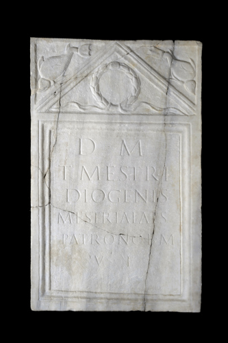 Stele funeraria a edicola, con corona di quercia al centro del timpano e delfini agli angoli; sotto il timpano, specchio centrale inquadrato da una cornice costituita da listello piatto, tondino e listello; al centro un'iscrizione su sei righe con dedica agli Dei Mani che Mestria Lais, liberta di Tito Mestrio Diogene, fece da viva per il patrono benemerente.