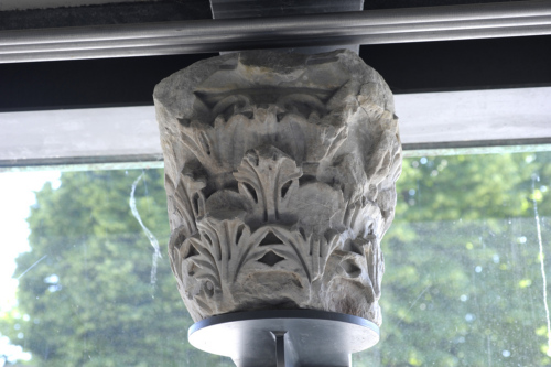 Le foglie della prima corona si toccano delineando forme triangolari e romboidali, mentre le foglie della seconda corona, molto slanciate e appiattite, si toccano senza formare alcuna sagoma di sfondo. Le estremità delle foglie della terza corona giungono sin quasi sotto l'orlo del kalathos. I cauli e le elici sono completamente scomparsi, mentre le volute, ridotte a un nastro appiattito, spuntano dalla foglia assiale della seconda corona e intersecano il bordo inferiore dell'abaco. Quest'ultimo, aggettante rispetto al kalathos, si articola con un cavetto e un listello molto semplificati; altrettanto stilizzata è anche la resa del fiore dell'abaco.