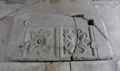 Lastra rettangolare con due grandi cassettoni (o lacunari) ricavati su un piano ribassato poco profondo, separati da riquadrature modanate con doppio listello e gola rovescia, decorati al centro da eleganti motivi floreali resi con ricchi particolari accuratamente dettagliati. Nel primo lacunare, un rosone a quattro petali e foglie alternati, con nervature delineate da profonde linee solcate mediane e lungo i contorni, intorno a un bulbo centrale costituito da un piccolo fiore con le stesse caratteristiche di quello più grande, trapanato al centro; nel secondo, una composizione più complessa, ottenuta con l'accostamento di quattro gigli disposti intorno a un bulbo centrale piatto, non lavorato, alternati a steli stilizzati con foglie arricciate verso l'interno e a fiori a girandola.