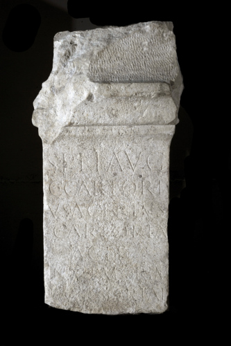 Piccola ara parallelepipeda, con tronco e base lavorati in un unico blocco. Il coronamento è costituito da un listello e gola rovescia, seguita da una fascia piatta e una obliqua verso il tronco, mentre la base è formata da un piccolo zoccolo. Sul fronte un'iscrizione votiva dedicata alla Spes Augusta da parte di Caio Cartorio Acereo e Cartoria Acte, occupa l'intero specchio epigrafico e si sviluppa su sette righe.