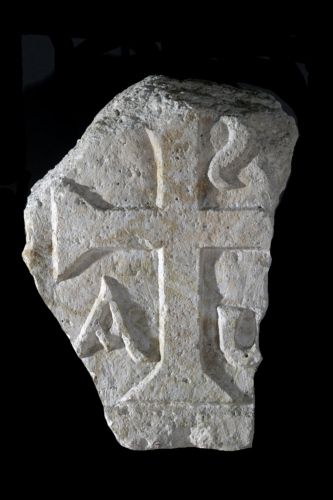 Frammento di coperchio di sarcofago, con sezione a "L" e modanatura a scalino nel bordo inferiore, per consentire l'appoggio sulla cassa, da cui si eleva una croce latina con braccia a terminazioni espanse, trasformata in monogrammatica con l'aggiunta di un elemento curvilineo per realizzare la lettera greca "rho" e formare le lettere iniziali del Cristo. Sotto i bracci orizzontali sono scolpite le lettere alfa e omega, esplicito riferimento alla simbologia apocalittica, a indicare l'inizio e la fine in Cristo.