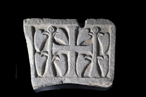 Il pezzo è inquadrato da una cornice a listello liscio che delimita tutti i bordi e delimita una campitura in cui, su tutti i lati visibili, è raffigurata una croce latina dalle terminazioni espanse, estesa per l'intera altezza dello spazio disponibile, con ai lati due elementi vegetali appoggiati sul listello di base con una doppia serie di rami su ogni lato, che si concludono con un ricciolo rivolto verso il basso, mentre la parte superiore termina in una losanga delineata da una solcatuta, forse una foglia stilizzata.