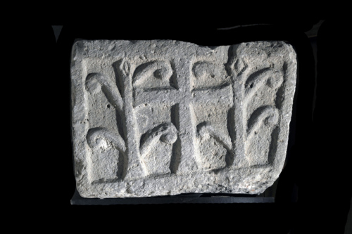 Il pezzo è inquadrato da una cornice a listello liscio che delimita tutti i bordi e delimita una campitura in cui, su tutti i lati visibili, è raffigurata una croce latina dalle terminazioni espanse, estesa per l'intera altezza dello spazio disponibile, con ai lati due elementi vegetali appoggiati sul listello di base con una doppia serie di due alberelli o palmette su ogni lato, che si concludono con una doppia serie di foglie lanceolate e in una losanga delineata da una solcatuta, forse una foglia stilizzata.