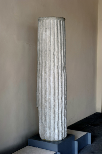 Fusto di colonna scanalato, rastremato verso l'alto, con ventiquattro scanalature stondate; un incasso a sezione circolare sul piano di attesa, per l'inserimento del perno.