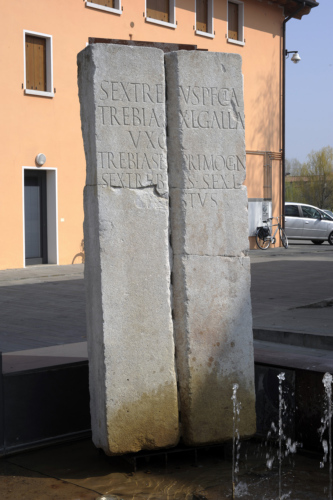 Grande blocco, con la faccia frontale e quelle laterali lavorate a gradina, il retro sbozzato. Sulla fronte lastra è incisa un'iscrizione su sei righe. La parte centrale è stata completamente scalpellata per ricavare una cavità alta per l'intera estensione del pezzo.