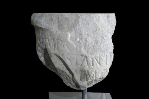 Miliario frammentario, leggermente rastremato verso l'alto e arrotondato al sommoscapo, con dedica all'imperatore Costantino distribuita su due righe, con punti di separazione arrotondati.