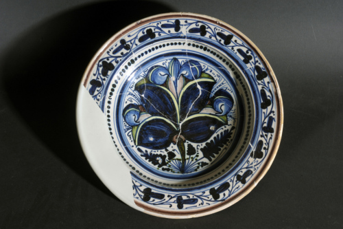 La decorazione pittorica, ottenuta con i colori del giallo-verde, verde, azzurro, azzurro-scuro, viola, è caratterizzata da un medaglione centrale nel cavetto, con all'interno un grande fiore composito costituito da tre fiori più piccoli che si innalzano da quattro foglie aperte su di un lungo stelo che esce da un cespo di sottili segmenti radiali con punto verde all'estremità e con inflorescenze triangolari allungate. Intorno, si sviluppa una cornice costituita da bande dipinte in azzurro scuro o a risparmio e una sequenza di perle unite da una linea sottile. Sulla tesa un racemo con foglie trilobate e, lungo il bordo, una banda viola. La superficie esterna è smaltata, ma non decorata.