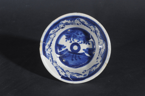 La decorazione pittorica, in azzurro, consta di un medaglione centrale nel cavetto, con un motivo geometrico di problematica identificazione, reso all'interno di un paese delineato in modo essenziale. La cornice presenta un motivo floreale stilizzato e la parete del cavetto è decorata da una sequenza di mezze palmette con sottili racemi, mentre l'esterno è decorato da pennellate radiali.