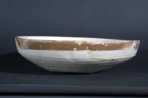 Ciotola con parete carenata a bordo assotigliato, fondo apodo concavo con umbonatura centrale. Sotto il bordo è stato realizzato un foro passante prima della cottura.