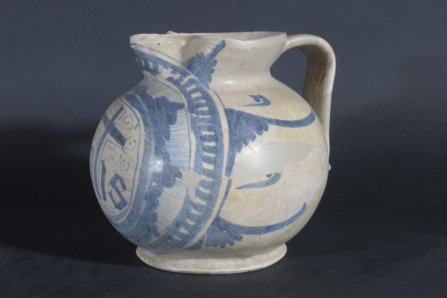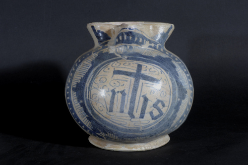 La decorazione pittorica, in azzurro scuro, consta di un medaglione ventrale che si estende in posizione frontale dal piede alla bocca e che contiene il trigramma berardiniano in lettere gotiche, accompagnato da elementi calligrafici. Intorno, si sviluppa una cornice composita formata da una fascia di fiamme, con fondo decorato a sottili pennellate radiali, corona dentata, sequenza di palmette peduncolate con elementi intermedi.