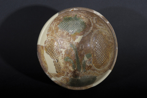 La decorazione pittorica, in giallo e verde, è caratterizzata dal motivo delle "tre mele", segnate da un fitto reticolo e che si innalzano da un cespo; gli spazi ottenuti sono riempiti da un motivo a doppio cerchio concentrico, che evoca una rosetta stilizzata.