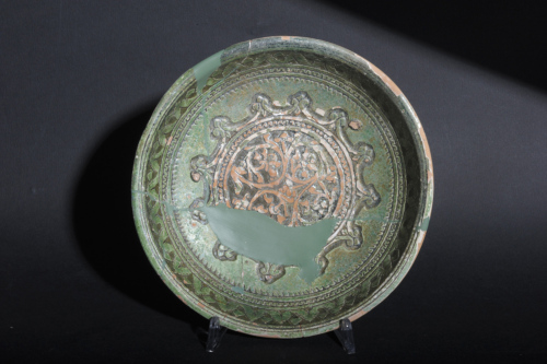 Piatto a cavetto piano con parete curva e orlo esoverso, piede a basso cercine con sezione rettangolare.