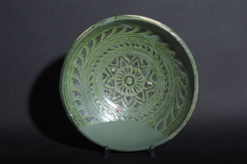 La decorazione pittorica, in verde, consta di un grande medaglione centrale, con un fiore racchiuso da una cornice a salienti; intorno, fasce concentriche che si estendono fino al labbro, decorate con un motivo a treccia e con una sequenza di foglie.