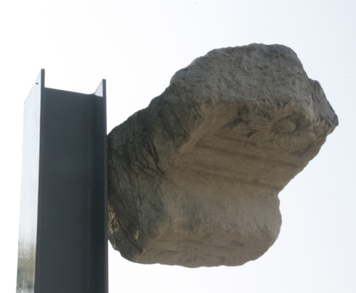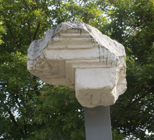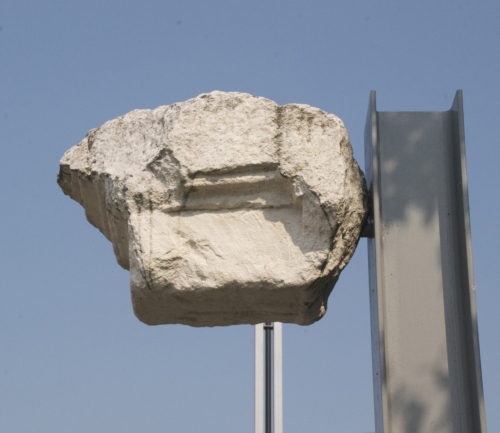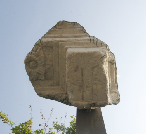 Frammento di architrave, con soffitto a cassettoni, di cui si conservano un riquadro profilato da un listello, con fiore a bottone centrale all'interno, e una mensola. Retro sbozzato.