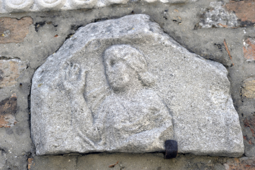 Frammento di rilievo con figura femminile, stante in posizione frontale, con il volto verso sinistra, il braccio sinistro alzato, mentre il destro è piegato intorno alla vita; indossa una tunica con mantello.