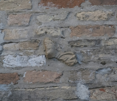 Non si esclude la possibilità che il frammento appartenesse a un fregio; la frammentarietà del pezzo e la scarsa visibilità ne impediscono tuttavia una lettura puntuale; la collocazione ne impedisce di rilevarne anche le misure.